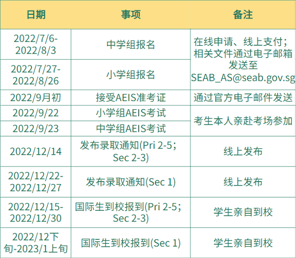 根據(jù)新加坡教育部給出的最新消息:2022年AEIS考試將于今年9月22日、23日舉行,小學(xué)組于7月27日,中學(xué)組于7月6日開放申請通道!