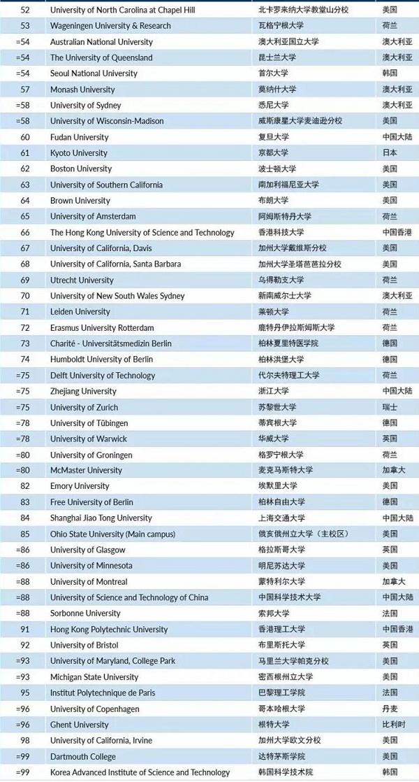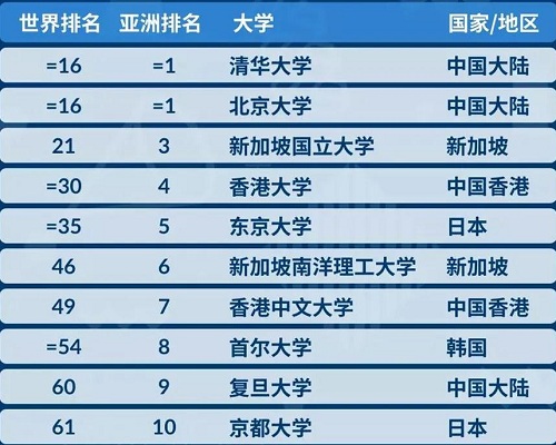 根據(jù)本年度的排名方法,亞洲不少高校都取得了不錯的名次,如清華大學(xué)和北京大學(xué)并列第16名、新加坡國立大學(xué)(第21位)、香港大學(xué)(第30位)、日本東京大學(xué)(第35位)、新加坡南洋理工大學(xué)(第46位)。