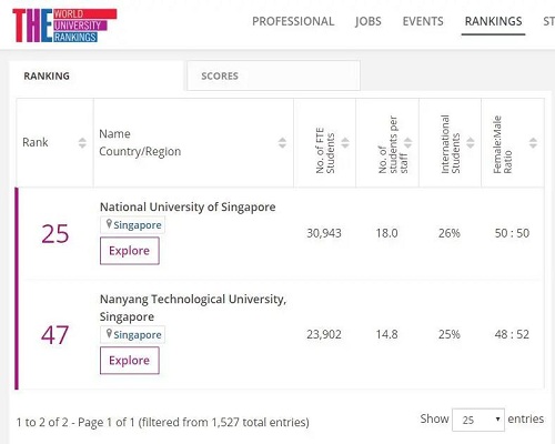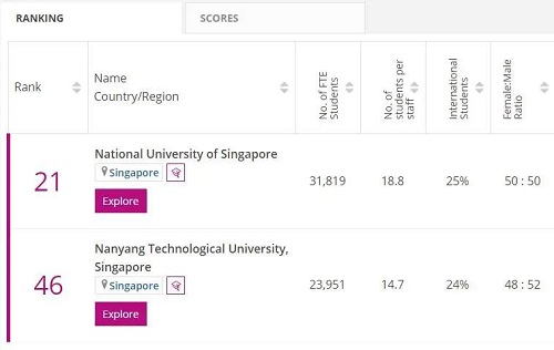 2021泰晤士高等教育世界大學(xué)排行榜-新加坡: