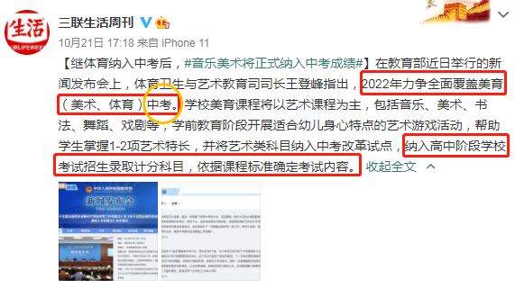 中國教育部日前提出體育納入中考,沒過幾天加碼2022年開始藝術(shù)類科目也以錄取計(jì)分形式納入到中考。