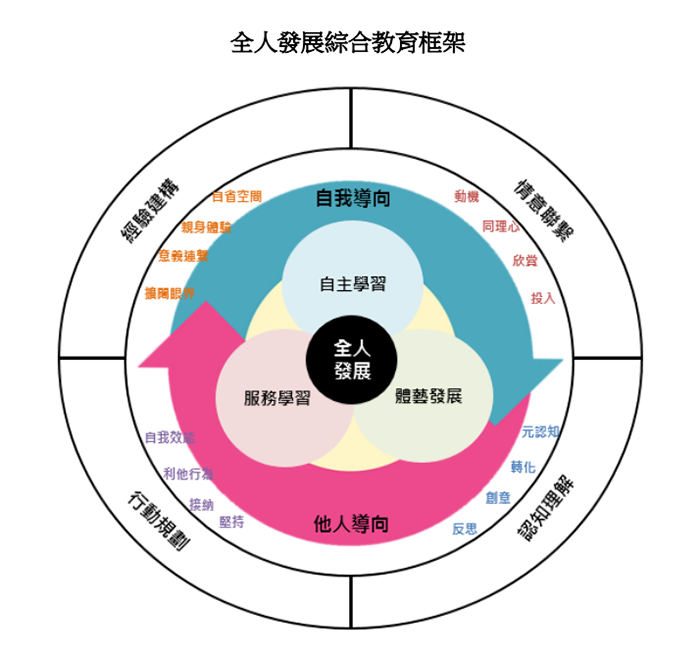 什么叫全人教育?自主學(xué)習(xí)、服務(wù)學(xué)習(xí)、體藝發(fā)展三大方面。讓孩子變成不僅從課堂中學(xué)習(xí);從實(shí)踐活動(dòng)中讓學(xué)生在親身經(jīng)歷及反思后,有機(jī)會(huì)把感受付諸行動(dòng),并透過展示自己的經(jīng)驗(yàn)和想法,沉淀對事情的認(rèn)知和內(nèi)化相關(guān)的價(jià)值觀;體育藝術(shù)多方面發(fā)展。