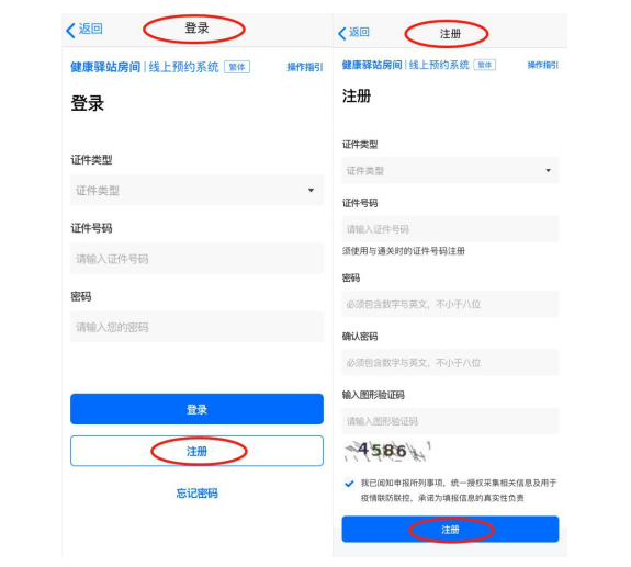 ·首次操作點擊「注冊」,進入頁面填寫證件類型、證件號碼、密碼、驗證碼完成注冊;已注冊過賬號可以直接登錄。