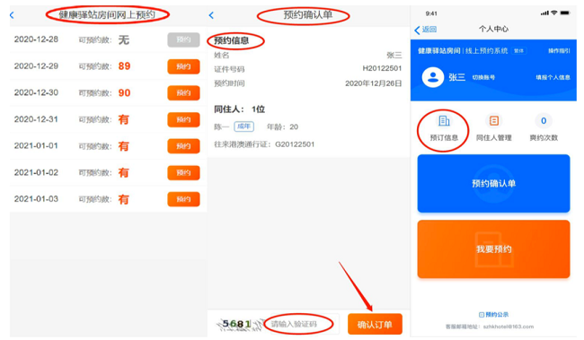 接著進入個人中心頁面,可查看預(yù)約信息、預(yù)約確認(rèn)單,進行個人信息、同住人信息和憑證預(yù)約等操作。
