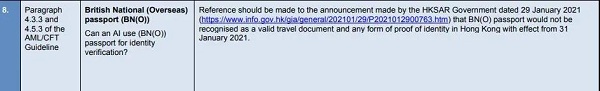 公會(huì)回應(yīng)稱不接受各認(rèn)可機(jī)構(gòu)的客戶以BNO作為有效旅行證件及身份證明文件,有關(guān)做法是按照政府在1月29日的聲明決定。