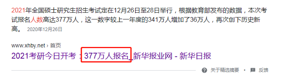 隨著就業(yè)形式的艱難,越來(lái)越多的畢業(yè)生選擇考研,考研人數(shù)劇增,報(bào)名人數(shù)已是屢創(chuàng)新高!根據(jù)教育部發(fā)布的數(shù)據(jù),2021年考研人數(shù)為377萬(wàn),這一數(shù)字較上一年度的341萬(wàn)人增加了36萬(wàn)人,再次創(chuàng)下歷史新高!